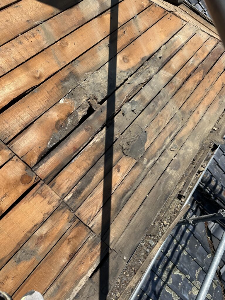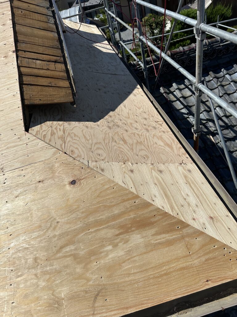 2. 施工中(下地): 瓦を剥がした状態と新しい合板