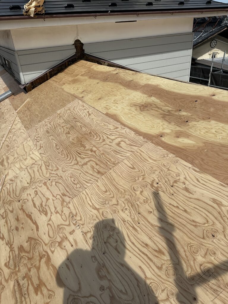 • 瓦の撤去と下地の補修: 瓦をすべて降ろし、古くなった野地板(下地の板)をしっかりと補修。さらにその上から新しい合板を重ねて、屋根の強度を高めました。