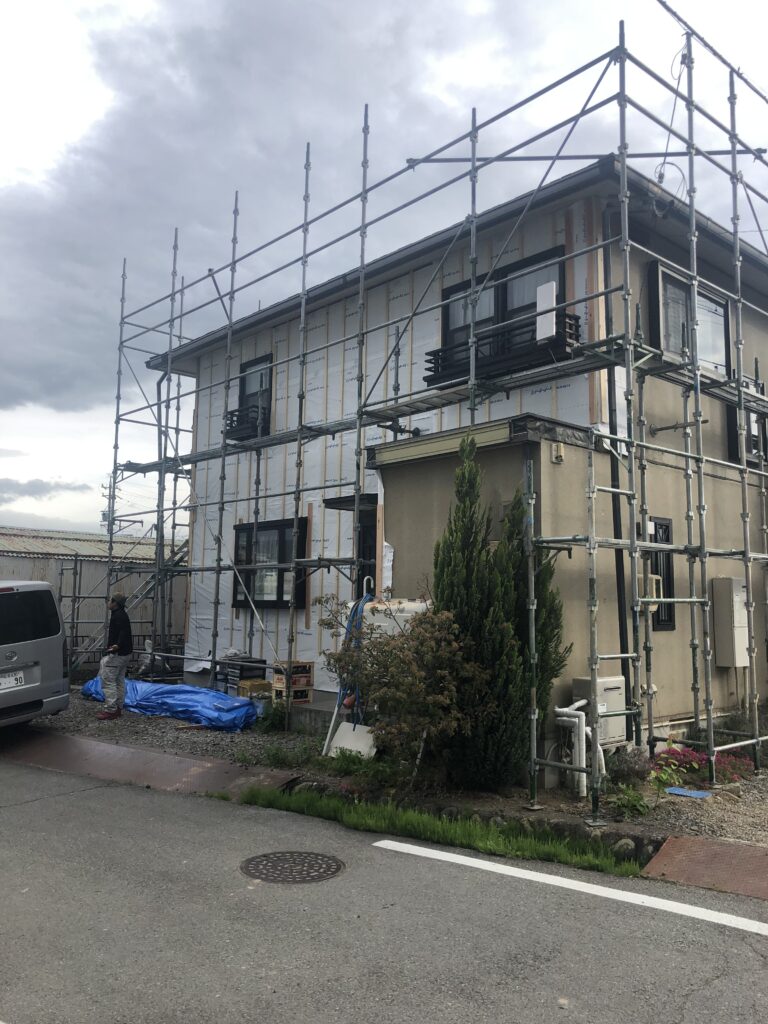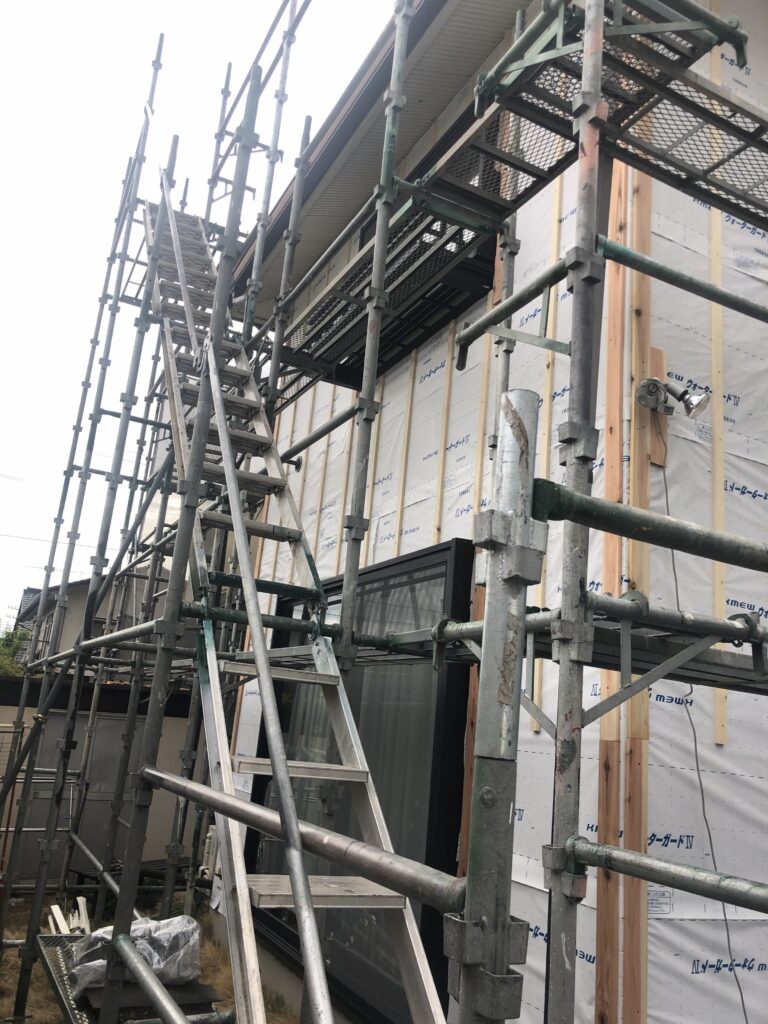 まずは安全な作業空間を確保するため、家全体にしっかりと足場を設置します。